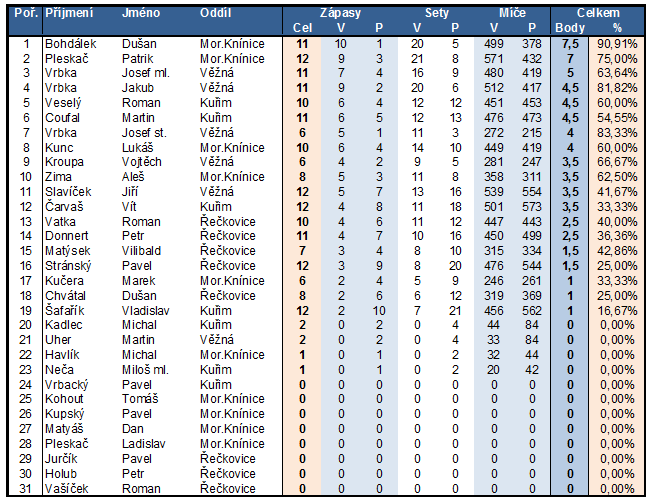 Na tomto místě naleznete statistiky hráčů v jednotlivých oddílech podle úspěšnosti .