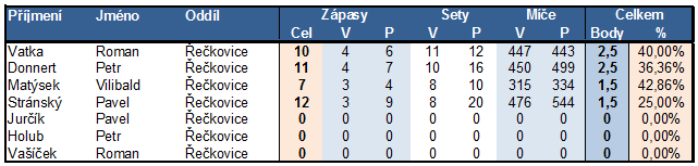| Orel Řečkovice | Sokol Mor. Knínice | 5.3 | 15:00 | 4:4 (9:10) | 1 | 2 |
